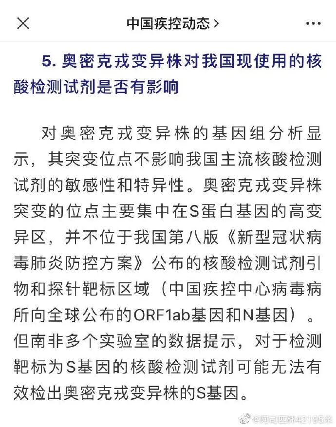 中疾控刚发表的信息里谈到:“5. 奥密克戎变异株对我国现使用的核酸检测试剂是否有影响对奥密克戎变异株的基因组分析显示,其突变位点不影响我国主流核酸检测试剂的敏感性和特异性。奥密克戎变异株突变的位点主要集中在S蛋白基因的高变异区,并不位于我国第八版《新型冠状病毒肺炎防控方案》公布的核酸检测试剂引物和探针靶标区域(中国疾控中心病毒病所向全球公布的ORF1ab基因和N基因)。但南非多个实验室的数据提示,对于检测靶标为S基因的核酸检测试剂可能无法有效检出奥密克戎变异株的S基因。”