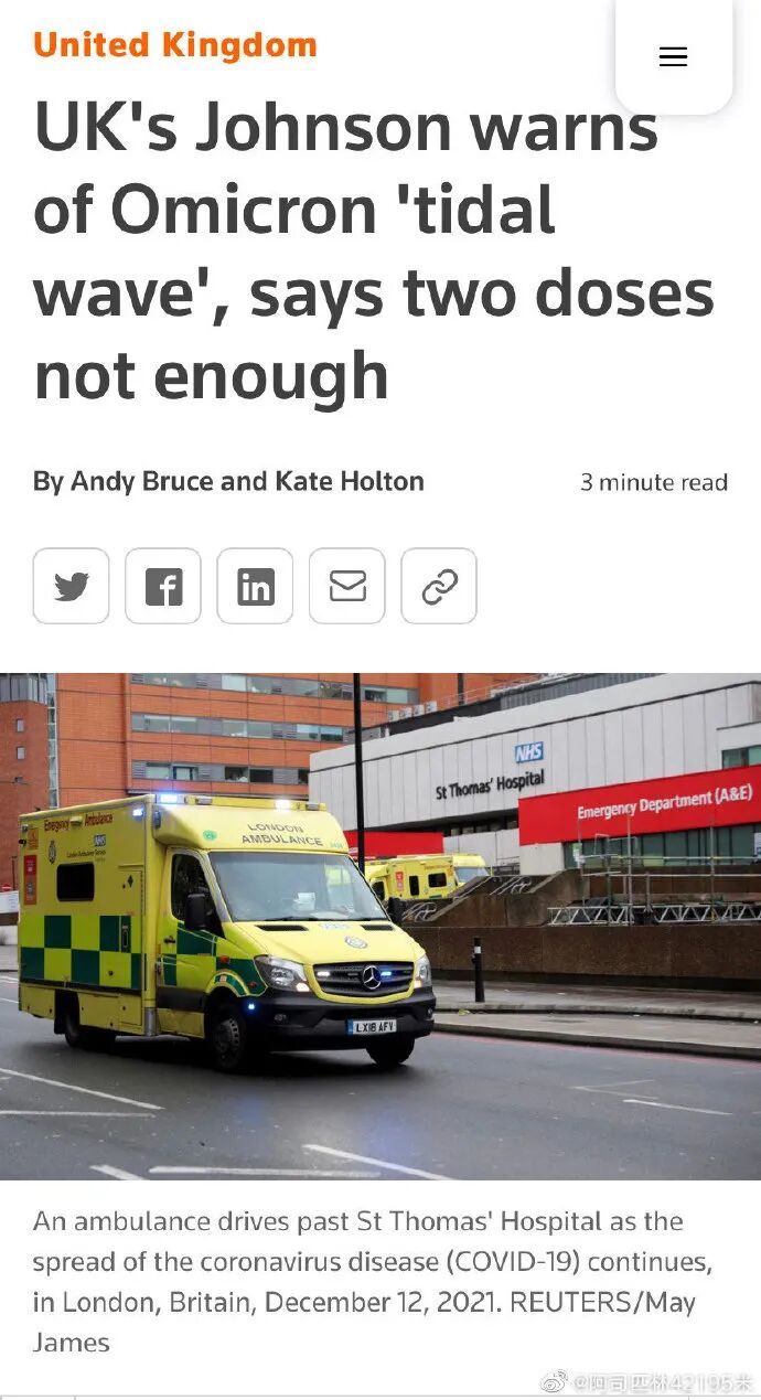 英国首相鲍里斯说,“至少一名有 Omicron的病人已被证实死亡。我们需要把“只是一种轻症”的想法先放一边,而认识到它在人群中飞增的速度。”
