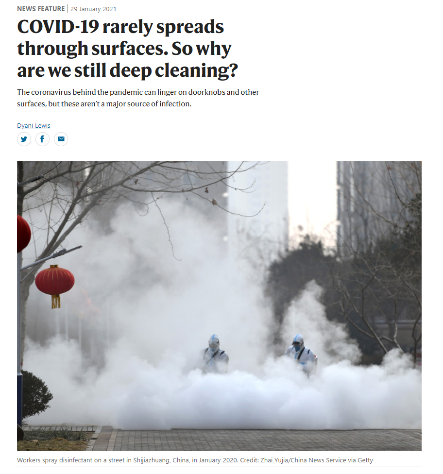 没有科学道理。《自然》杂志登过一篇文章,主要谈国外过度消毒的问题,文章包括了一张2020年1月石家庄在室外喷雾“全面消杀”的照片,作为没有科学防疫的例子。