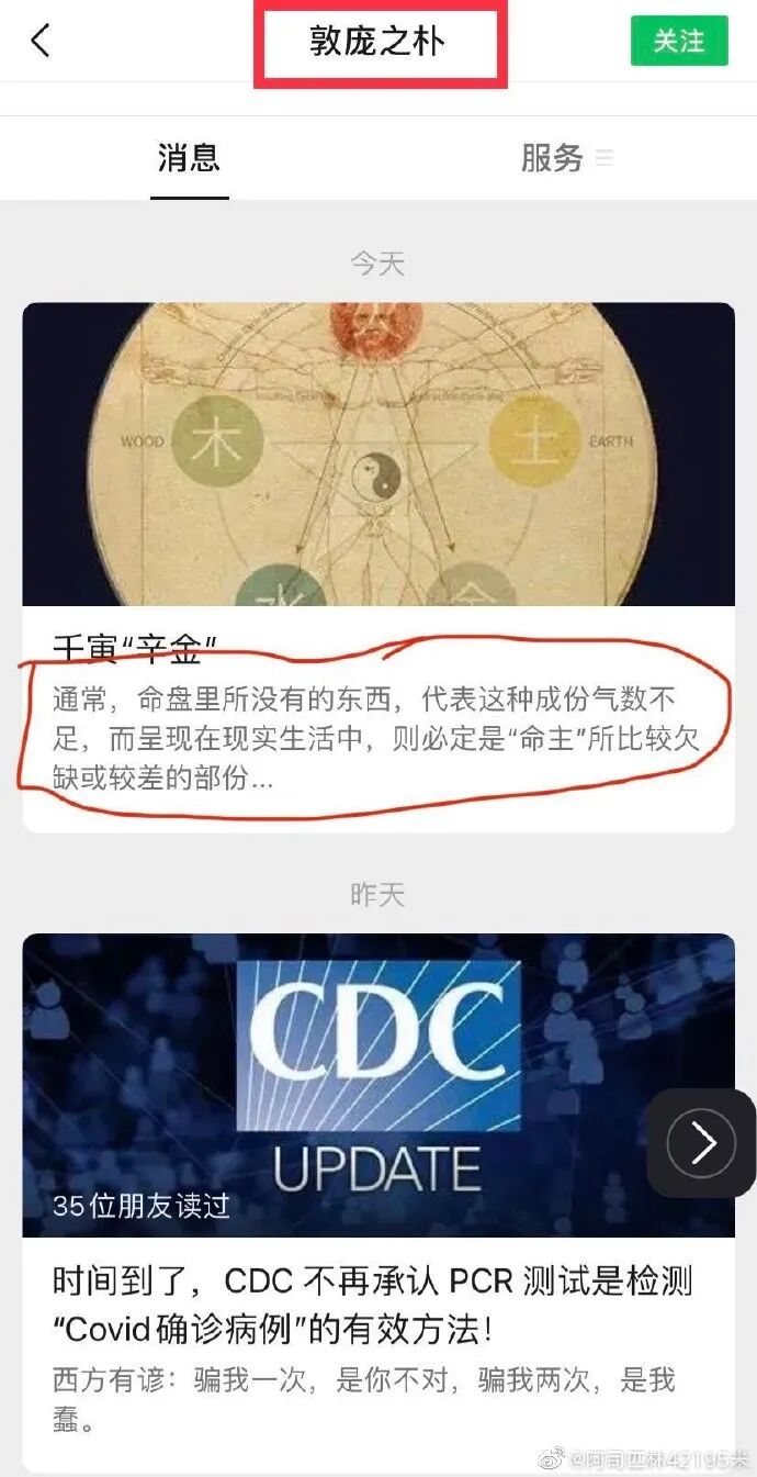 1,首先,看这个公众号名字就不能打开。重大医学信息不太可能由一个非专业的公众号来宣布。后来发现这个公众号最新的一篇文章是研究“命气”的,和写CDC的文章放在一起,好奇葩。