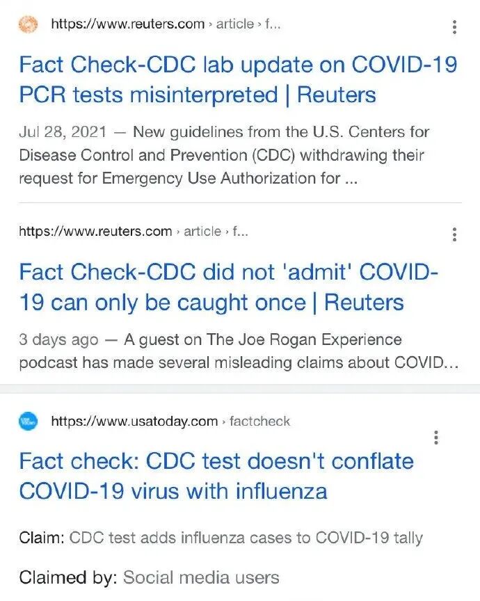 2,看了一眼公众号标题《时间到了,CDC 不再承认 PCR 测试是检测“Covid确诊的有效方法》,大多数谁谁“承认”的文章要么造谣、要么夸大,所以这篇文章更不可信。3,最后用英语查一下:cdc pcr differentiate flu covid FACT CHECK前面是有关内容,后面一定要加 fact check这两个词,我用大写是为了强调。直接拷贝我这个去搜索。