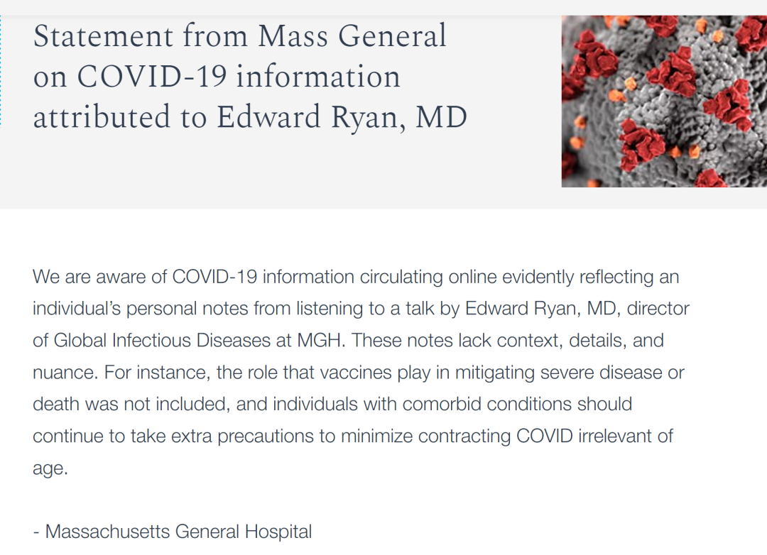 我猜今天星期一他会发声,因为舆论的压力太大了。果然,麻省总医院发了一个声明:“我们知道网上流传的COVID-19信息显然反映了一个人在听了MGH全球传染病主任Edward Ryan博士的讲座后的个人笔记。这些笔记缺乏背景、细节和细微差别。例如,疫苗在减轻严重疾病或死亡方面的作用没有被包括在内,有合并症的人不管什么年龄都应该继续采取额外的预防措施,以尽量减少感染COVID。”