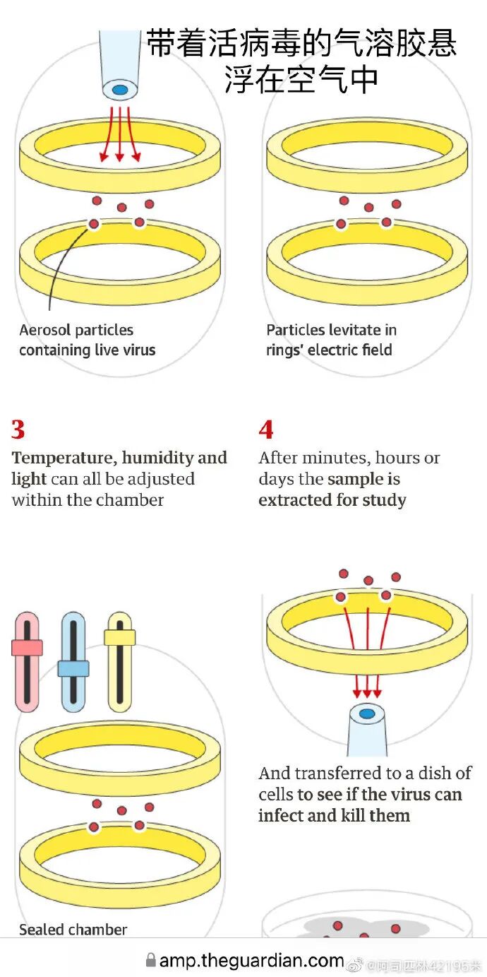 他们设计了一种新的装置,通过电场,可以把带有活病毒的气溶胶颗粒(直径5-10微米)悬浮在空气中来做研究。他们还研究了不同温度、适度、光线下病毒的存活情况。