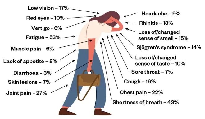 症状这么多、这么杂,医生怎么诊断?下面说说几个常见的问题。— 怎么定义新冠后遗症?目前的定义是:被新冠感染后出现的各种身体和精神的症状超过4周,并且无法通过其他诊断来解释,就可称为新冠后遗症。— 新冠后遗症有哪些症状?新冠后遗症的症状主要分为两大类。第一类是身体症状,常见的有:•疲劳(15% - 87%)•呼吸困难(10% - 71%)•胸痛或胸闷(12% - 44%)•咳嗽(17% - 34%)不太常见的症状包括嗅觉丧失、关节痛、头痛、干燥综合征、鼻炎、味觉障碍、食欲不振、头晕、肌痛、失眠、脱发、出汗和腹泻。第二类是心理或认知症状。与其他呼吸道感染比如流感的康复者相比,新冠后遗症的心理问题更常见,很多病人都伴有焦虑抑郁等精神症状,新冠后患上精神疾病的风险更高。认知功能障碍,即英语里通俗的说法叫脑雾(brain fog)或脑袋不清醒,比如康复后记忆力、理解力、学习能力有所下降。— 到底有多少新冠病人会留下后遗症?文献中多见为10-30%的新冠患者有后遗症。但这些研究大多来自疫情早期、更多重病人(曹彬团队的后遗症研究以前写过,可在公众号里搜索“后遗症”)、以及不少研究没有对照组,真正有后遗症的比例应该低不少。— 谁会得上新冠后遗症?新冠后遗症的人群是在发展变化的。疫情早期的数据显示,住院患者、有基础疾病的老年患者、出现医疗并发症的患者、以及长期住院或入住 ICU 的患者需要更长的恢复过程,因而更多属于有新冠后遗症。然而,随后的数据显示,即使病情较轻、从未住院的患者,也经常反映有长期症状,而且有更多年轻患者和更多妇女。第三个特点是新冠后遗症的治疗必须身心兼顾。现在美国不少大医院设有新冠后遗症的门诊。因为新冠后遗症的病人常常伴有心理因素,第一次看病可能就会帮你约两个门诊:既要看一般的医生,也要看看心理医生。因为得了新冠的人实在太多,今后诊治后遗症病人的任务会逐步下放,主要还是要靠初级医生。考虑到全球大量的新冠感染者,新冠后遗症对医疗系统的负担将是巨大的。现在医学界科学界都在研究后遗症到底是怎么回事,在弄清之前,医生不轻易因为没有找到证据比如CT异常就说你没有后遗症,而是根据你有什么问题就解决你的问题。有不少后遗症的症状只是人体在慢慢地恢复之中,并不是落下了什么病根。比如丧失味觉嗅觉的人88%都能在两个月内恢复,比如体力的恢复也是逐渐的过程。有一点要注意的是,就像不要打了疫苗之后身体有点不舒服就怪疫苗,也不要新冠过后身体出现新症状就说是后遗症,有问题就要去查一下。因为我们的身体还是会得各种各样的病的,用后遗症解释一切反而可能耽误了病情。对于后遗症,各国公卫机构都很重视。中国2020年3月就发布了《国家卫生健康委办公厅关于印发新冠肺炎出院患者康复方案(试行)的通知》。美国投资了11亿美元用来研究。怎么避免后遗症?预防感染尤其是严重感染是预防新冠后遗症的最佳方法。因此,必须加强疫苗接种和加强公共卫生措施以减少后遗症的出现。目前,世界卫生组织提出对新冠后遗症要做到三个R:- Recognition(对新冠后遗症有更多认知),- Research(继续加强这方面的研究),- Rehabilitation(帮助病人康复)。(首发在“CC情报局“上,图片来自网络)
