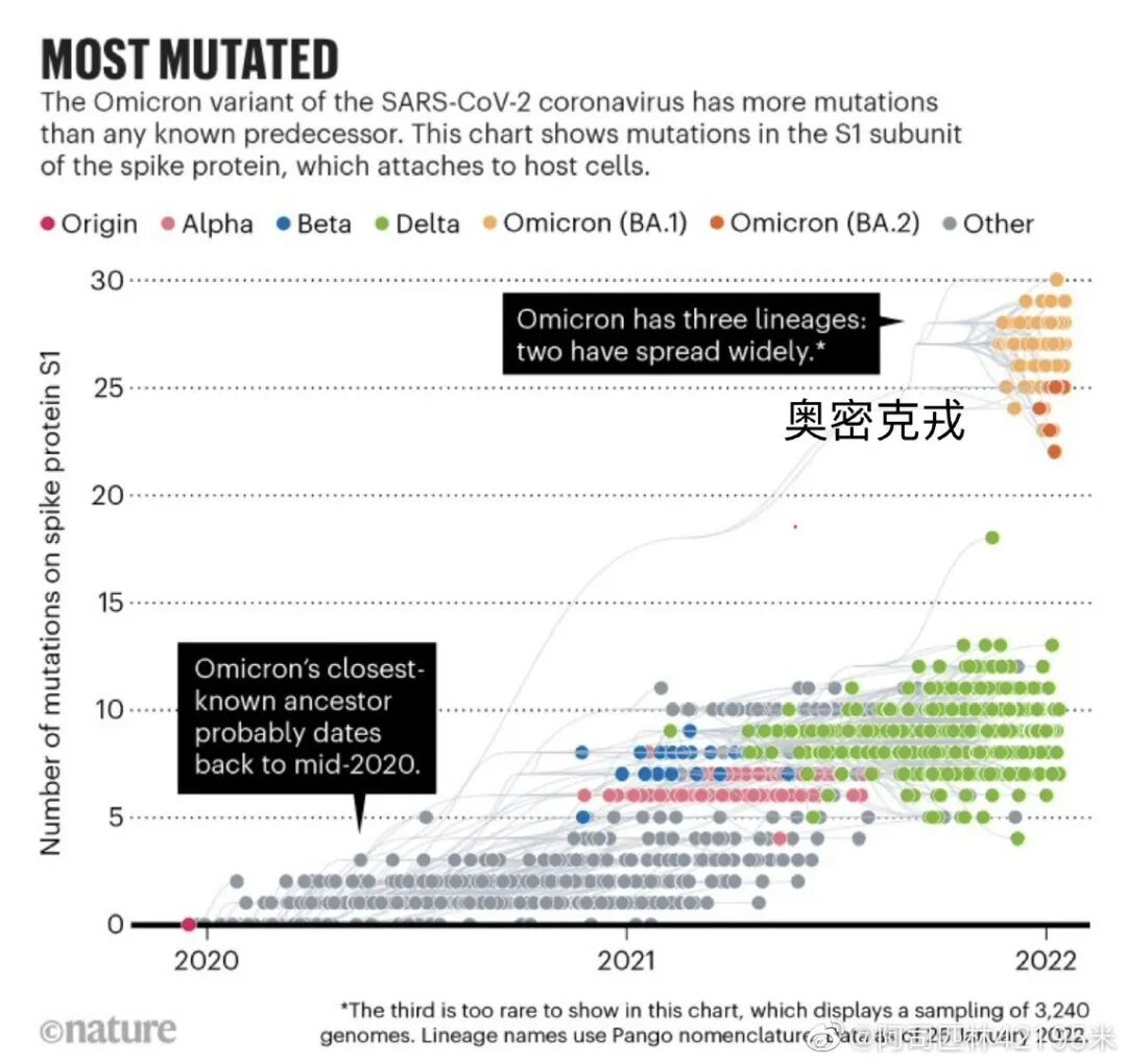 - 小妹BA.3 目前是养在深闺无人识。奥密克戎病毒株的特点是和其他的毒株相差悬殊。和原始株比,奥密克戎在关键的部位有30个突变。姐姐和妹妹在这个关键部位的结构是一致的。