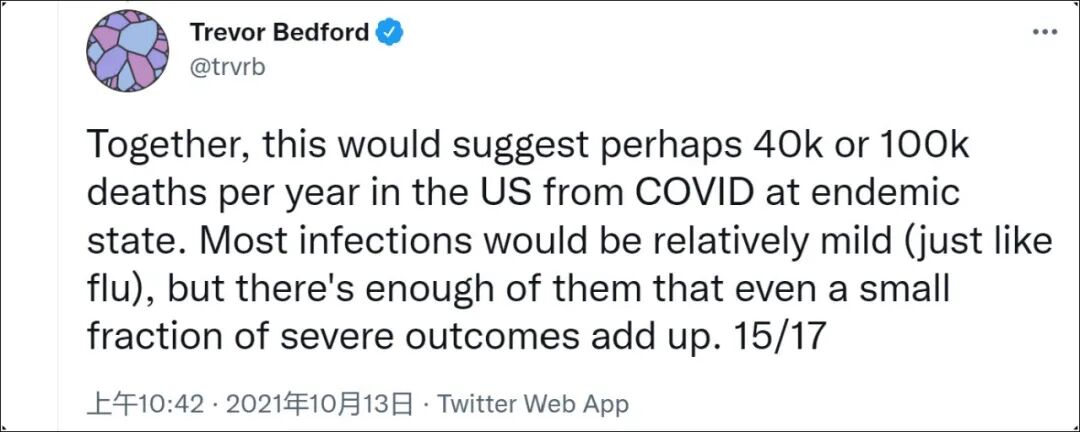 现在专家们认为,一旦整个人群对病毒有了免疫力,病毒的传播和疾病的发生就会下降,疫情会从“全球大流行”的状态结束,从而过渡到“地方性的传染病”。那时,世界会是什么样子呢?由于疫苗分配不均,全世界将在不同的时候逐渐达到地方性流行。然而,即使某个地区所有人口通过被病毒感染或接种疫苗获得了免疫力,由于免疫力随时间会消退和病毒的不断进化,仍然可能存在大量的病毒传播。比如,季节性流感是一种地方性的呼吸道病毒,几乎每个3岁以上的人都对流感有免疫力。但是,流感每年还是会感染约10%的成人,在美国每年造成约3万人死亡。中国也类似。据复旦公卫学院余宏杰团队联合中国疾控中心和香港大学在《柳叶刀公共健康》发表的论文表明,2010-2015年中国每年有超过8.8万人死于流感, 八成以上为60岁以上老人。贝德福德博士预计,最终COVID的地方性流行情况会类似于流感,病毒在社区仍会有相当程度的流行,但是和全球大流行时比,疾病对社会的负担下降了。贝博士提到预测未来的关键参数包括:1,R0(基本传染数),2,免疫力的消退,3,抗原漂移,4,感染病死率(IFR)。1,R0指一个带病毒者在完全易感的人群中再次感染的平均人数。季节性流感的R0约为2,原始新冠病毒的R0大约是3,德尔塔变种的R0可能是5或6。在其他条件相同的情况下,新冠更高的R0会带来更多的病毒传播。2,新冠抗体免疫力会怎样消退,现在还不清楚。冠状病毒共有七种,分为四种季节性冠状病毒(通常引起普通感冒)和三种SARS样冠状病毒(包括萨斯、MERS、新冠)。虽然季节性冠状病毒大约每隔3年就会引起再次感染,但很难从这些病毒完全推断出SARS样冠状病毒的情况。但据目前观察到的新冠免疫力减弱的情况,贝德福德博士认为,在新冠"地方性流行"的状态下,免疫力每年至少会有一部分消退。3,抗原漂移,指基因突变导致抗原的小幅度变异。这种个别变异不同于流感的病毒重组,不会产生新的亚型,属于量变,没有质的变化,多引起中小规模的流行,不会对病毒流行产生大范围影响。但如果抗原漂移不断积累,且积累的速率不断增强,那么也许过一段时间需要再打疫苗。虽然到目前为止,新冠病毒的抗原漂移相对较少,但由于全世界疫情严重,自然选择适者生存,促使传播性更强的病毒(开始是Alpha后来是Delta),存活下来成为主要病毒株。具体来说,新冠病毒刚从动物跨界侵犯人类时,还不太适应人体,有点笨手笨脚。随着病毒的进化,我们已经看到刺突蛋白的S1区域发生了快速的适应性突变,让新冠病毒进攻人体更加驾轻就熟了。贝博士认为,随着疫情变成地方性流行,我们将看到新冠病毒还会不断发生突变(抗原进化),其变化速度会和甲型H3N2流感病毒相似。在高R0、免疫力消退和抗原漂移这三点的共同作用下,新冠会变成季节性的流行病,每季会有20%或30%的人口被感染。这个百分比比流感要高,因为R0为~6,而不是流感的~2。