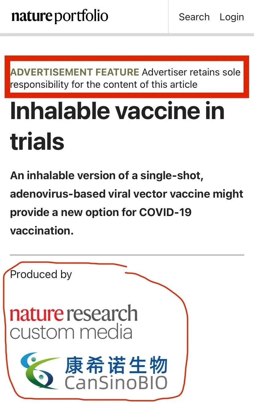 但Nature Index网页上写的是“广告”,内容是康希诺自己提供的: