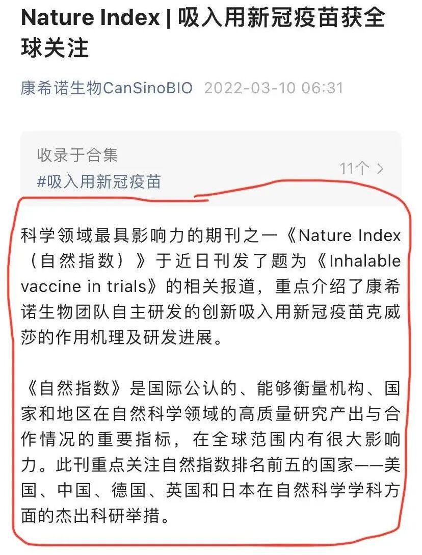 康希诺3月份发文说他们的“吸入用新冠疫苗获全球关注”: