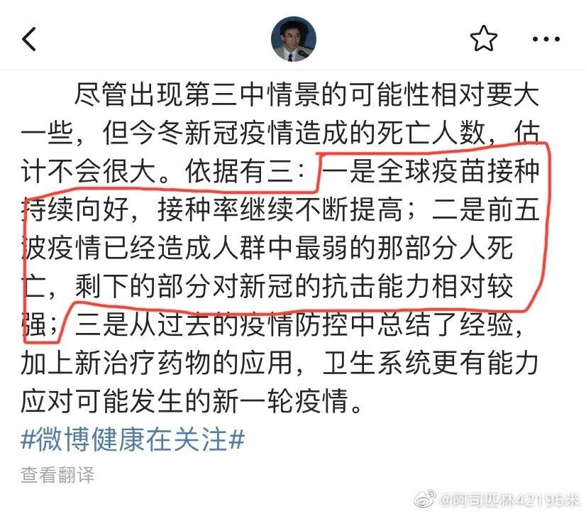 首先,吴博士认为死亡会不多是因为“前五波疫情已经造成人群中最弱的那部分人死亡,剩下的部分对新冠的抗击能力相对较强”。