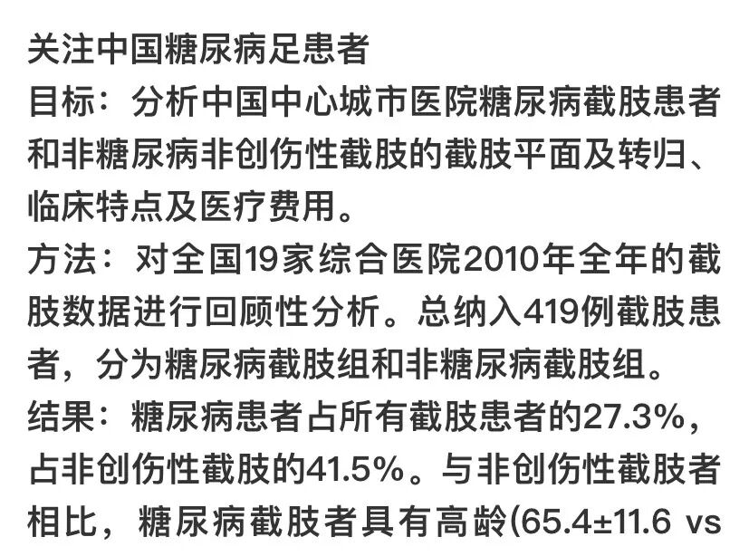 对中国19家综合医院2010年全年的截肢数据进行回顾性分析,发现糖尿病患者占非创伤性截肢的近一半(41.5%)。