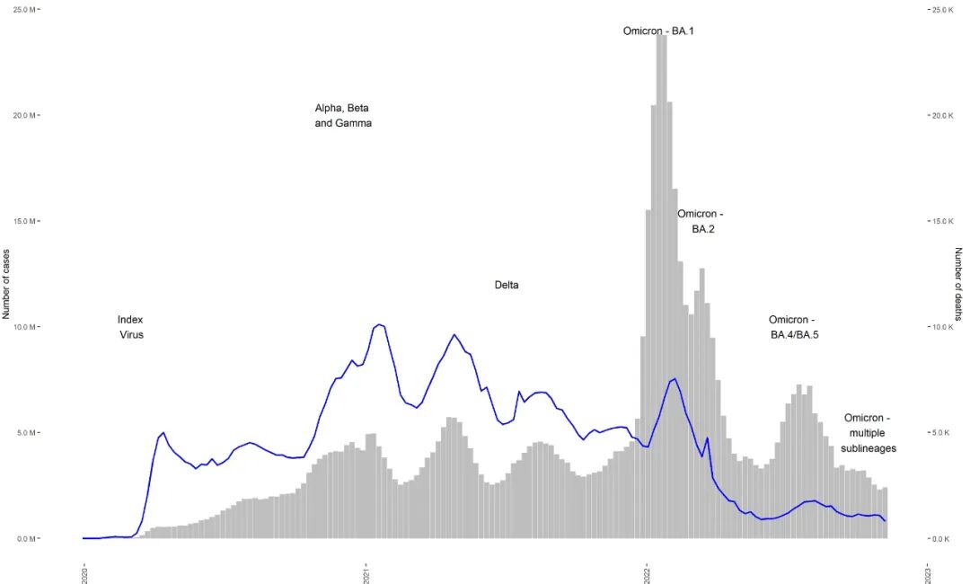图:灰色背景是全球新冠病例,蓝线是死亡人数。虽然奥密克戎致病力较轻,还是导致了不少死亡。最近病例的下降可能反映了现在测得越来越少了。