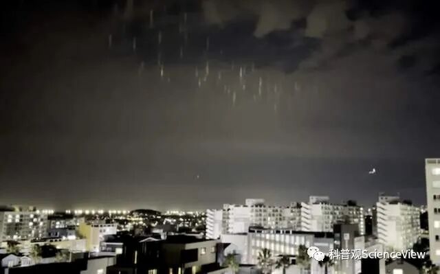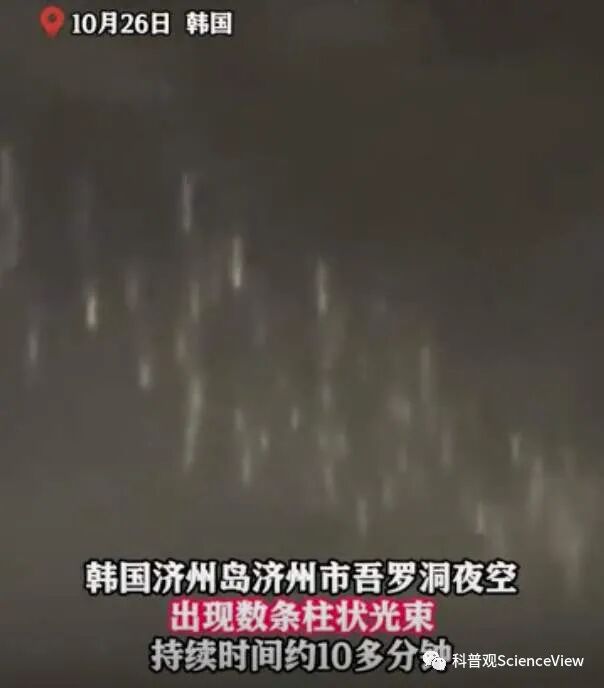 韩国济州岛济州市吾罗洞的市民,突然看到天空上出现了诡异的一幕,数百条垂直光柱突然出现在夜空,像极了流星雨划破天空,但区别于流星雨的是,这些光柱是在天空静止的。