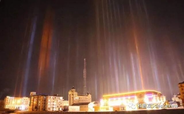 寒夜灯柱现象,实际上是大气中冰晶反射灯光形成的罕见物理现象。