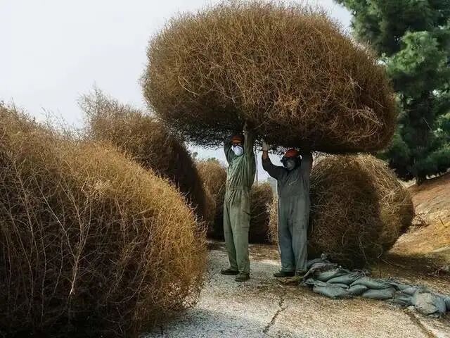 因此,专业人员在清理风滚草的时候,都必须从头到脚佩戴好专门的护具,以防被风滚草的尖刺扎伤。