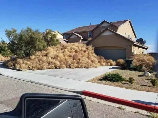 从照片里我们可以看到,大量的风滚草堆积在了房子周围,将房子围得简直水泄不通。