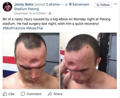 图中这位选手的头骨,就是被对手用一记强力肘击给干碎的,我们明显能看到他的额头已经凹陷了下去。