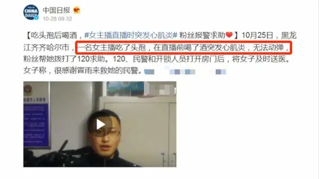 事后才知道导致她心肌炎突发的原因,竟然是开播前喝下的酒。