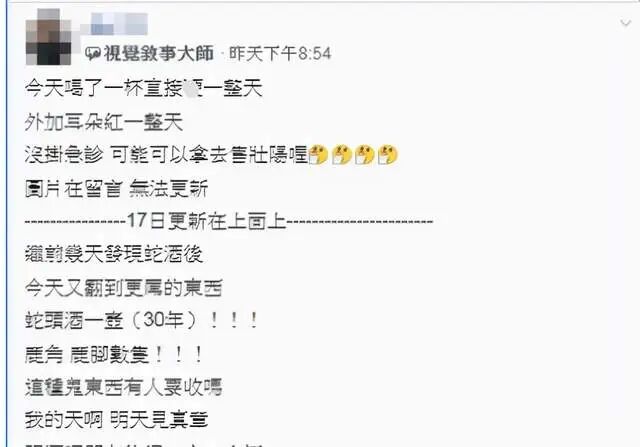台湾一名男性也曾喝下一杯30年的蛇酒,生理反应持续了一整天。