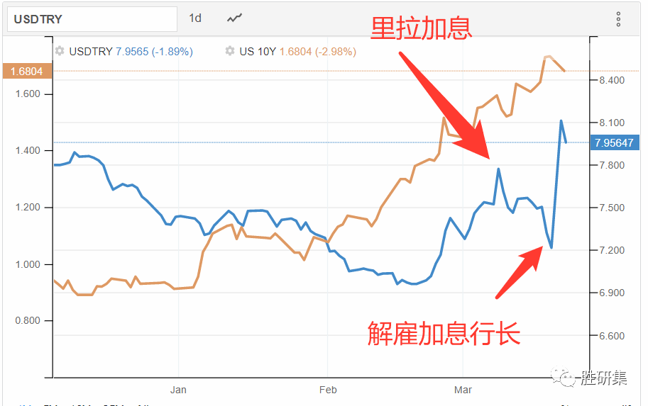 可以看出最近两天走势,土耳其里拉在美债下跌后,对美元汇率明显下跌,而加息后回归。