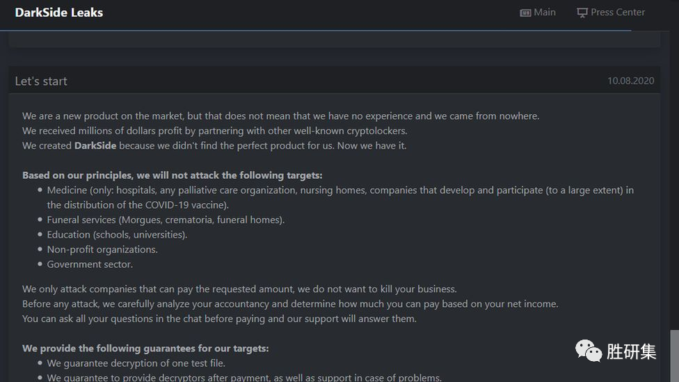DarkSide在其网站上写道:“我们的目标是赚钱,而不是给社会制造麻烦。”