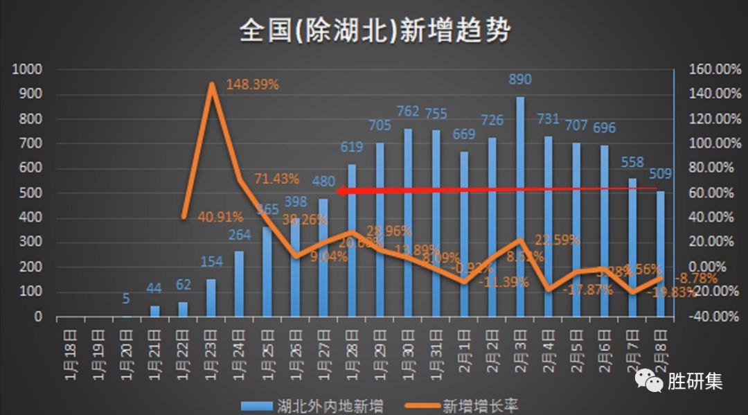 1月28日,大年初四,全国除湖北以外地区新增确诊病例619例,2月8日,正月十五,全国新增确诊病例509例。