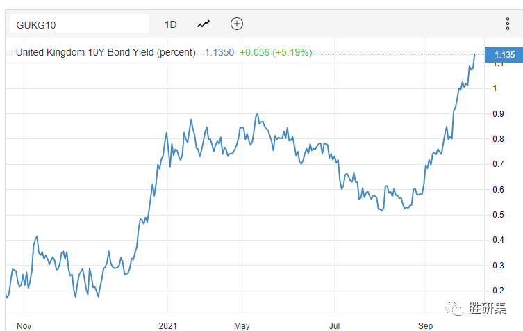 英镑十年期国债收益率,突破历史性的1.1%, 今天高达1.135%。