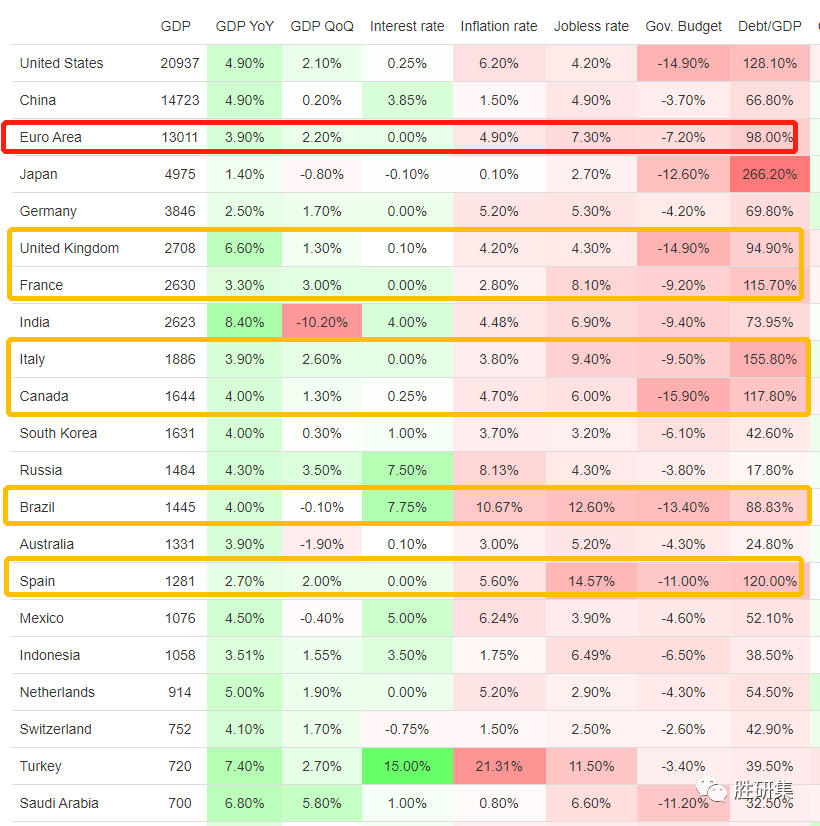 整个欧洲2020年底,政府负债率已经高达GDP的98%,今年绝对超过100%,甚至更高。