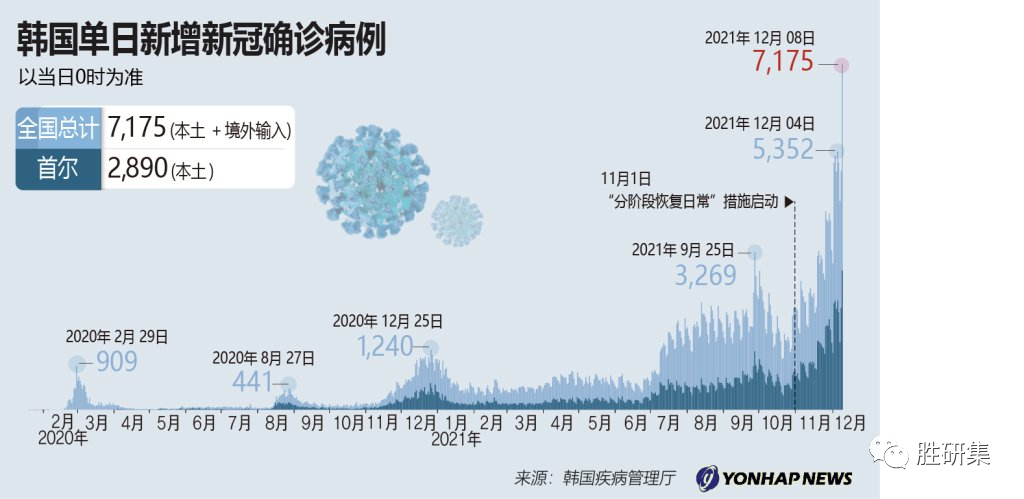 韩国中央防疫对策本部12月8日通报,截至当天0时,韩国较前一天0时新增感染新冠病毒确诊病例7175例,较前一天骤增2221例,