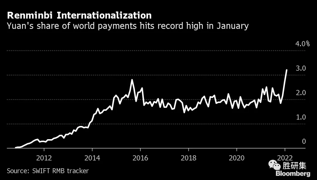 据环球银行金融电信协会(SWIFT)的数据,使用人民币支付的市场份额跃升至创纪录的3.2%,突破了2015年创下的前次高点,当时中国将人民币贬值以提振出口,而这次人人民币汇率持续上涨。