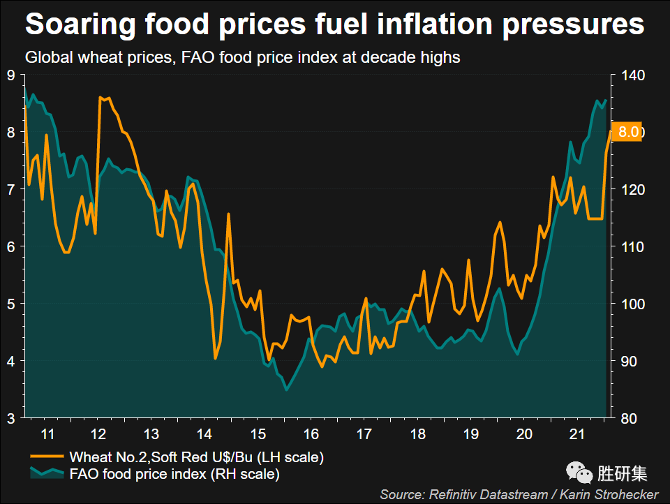 作为黑海地区粮食流出大国的乌克兰如果发生冲突,粮食输出可能会中断,进而会对价格产生重大影响,并进一步加剧食品通胀。