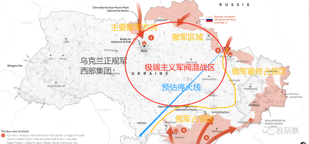 俄罗斯军队西路军和南路军打到蓝色线附近,估计会停火,兵力和后勤都不足以继续推进占领整个乌克兰。
