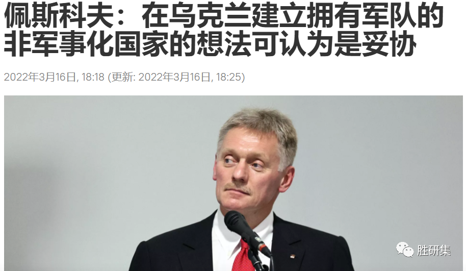 3月16日 - 克里姆林宫周三表示,乌克兰去军事化后,按照奥地利或瑞典的做法拥有自己的军队,这被认为是一个有可能达成的妥协方案。