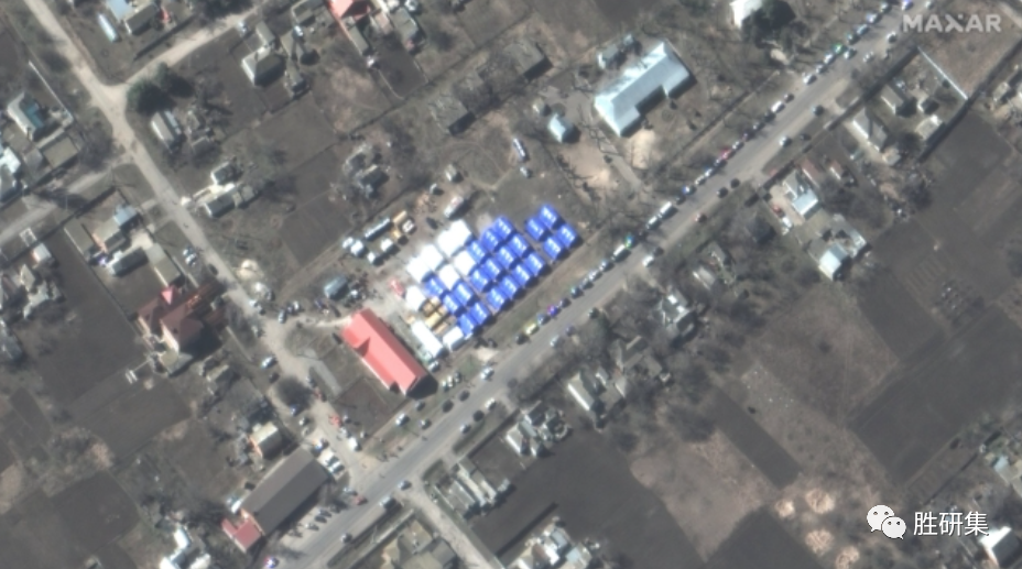卫星图像显示,在分离势力控制的顿涅茨克省沿海村庄贝齐门内的一个前农贸市场的一个营地里,架设了多达30顶蓝白帐篷,距离马里乌波尔郊区仅11英里。