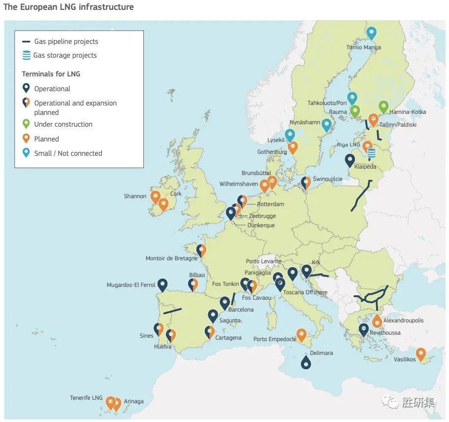 欧洲LNG接收终端分布图,其中深蓝色表示已投运,半蓝半黄表示已投运且计划扩建,黄色表示计划建造,绿色表示在建中。来源:欧委会