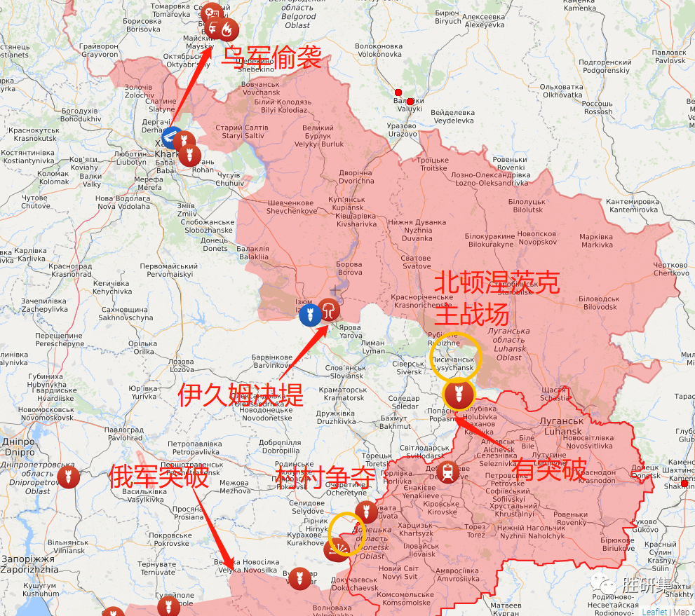 1、俄军从哈尔科夫地区的伊久姆南下,卢甘斯克出发从波帕斯纳亚北上,企图形成对北顿涅茨克乌军主力的合围。