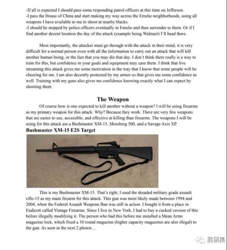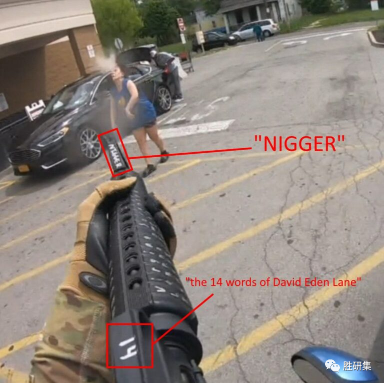 这名枪击犯的AR-15步枪上写着“1488”的标语,“1488”是大卫·伊登·莱恩(David Eden Lane)14个字中的一个著名标语,88代表“希特勒万岁”。