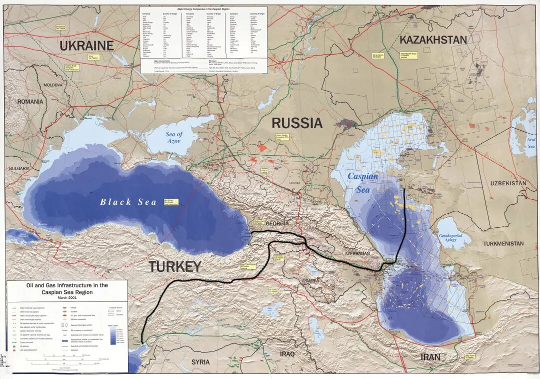 2、往西通过里海上的油轮,运进阿塞拜疆巴库,衔接已有的巴库-第比利斯-杰伊汉等管线,再往欧洲转运。