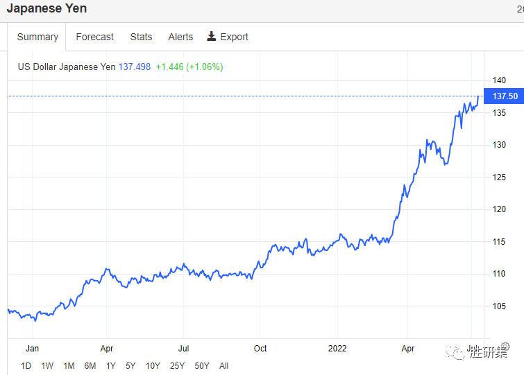 与此同时,日元自2012年开启长期贬值趋势,从75.5日元/美元跌到目前的约137日元/美元,几乎腰斩。