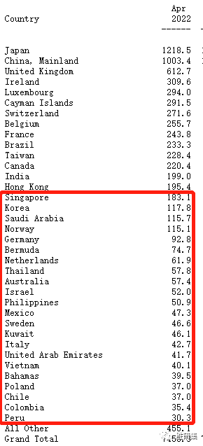 新加坡以下,韩国、德国、沙特、挪威、等主要持有国都没有那么多美债。
