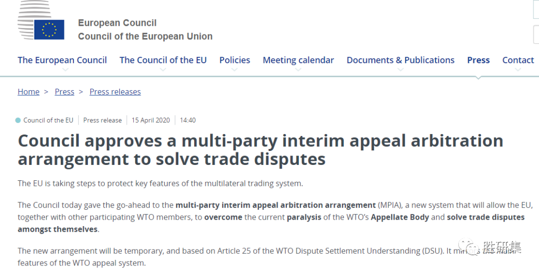 在2020年1月达沃斯论坛期间,欧盟与其他16个WTO成员发表联合声明称,将基于世贸组织《关于争端解决规则与程序的谅解》第25条,设立《多方临时上诉仲裁安排》(MPIA)。