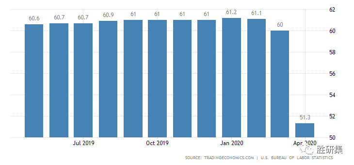美国就业率从2月的61.1%暴跌到4月51.3%, 这就是16%的增幅,叠加2月失业率大约为4%,也同样印证了20%的失业率!