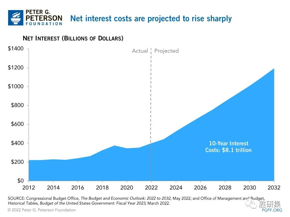 利息支出未来十年内将增加近三倍,飙升至1.2万亿美元,在此期间总计8.1万亿美元。