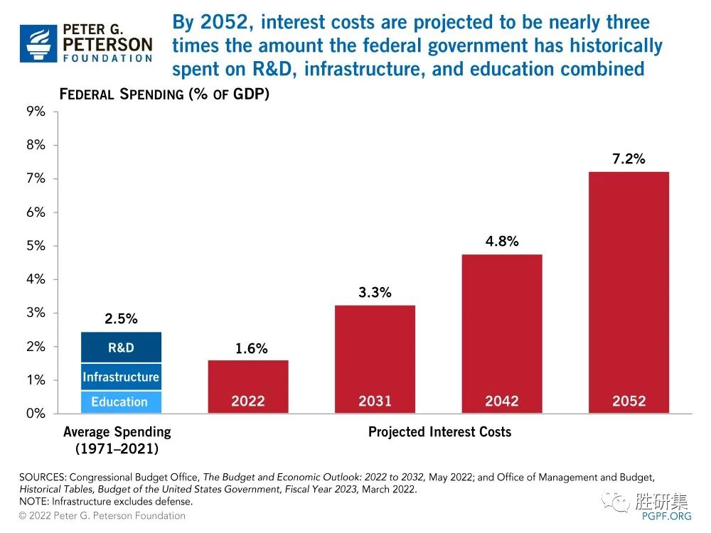 国会预算办公室估计,到2052年,利息成本预计将是联邦政府历史上用于研发、非国防基础设施和教育的总成本的近三倍。