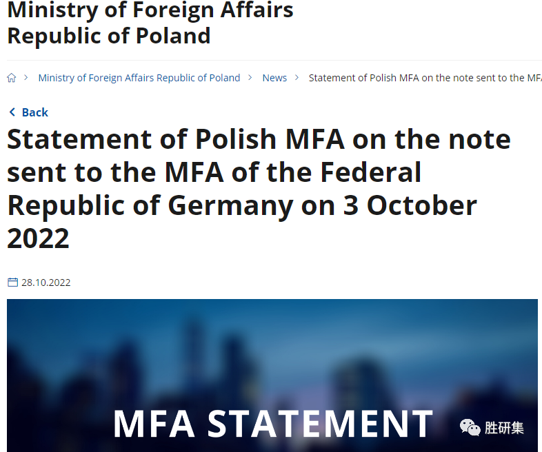 波兰外交部于10月28日,在其官方网站发布《关于2022年10月3日发给德意志联邦共和国外交部的照会的声明》。