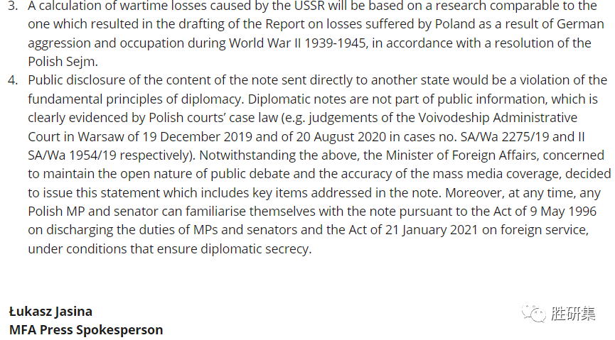 4、公开披露直接发给另一个国家的照会内容将违反外交的基本原则。外交照会不是公共信息的一部分,波兰法院的判例法清楚地证明了这一点(例如,华沙省行政法院2019年12月19日和2020年8月20日分别对编号为SA/Wa 2275/19和II SA/Wa 1954/19的案件作出的判决)。尽管如此,外交部长为了保持公开辩论的公开性和大众媒体报道的准确性,决定发表本声明,其中包括说明中提到的关键项目。此外,根据1996年5月9日关于议员和参议员履行职责的法案和2021 1月21日关于外交服务的法案,任何波兰议员和参议员都可以在任何时候熟悉该说明,前提是确保外交保密。