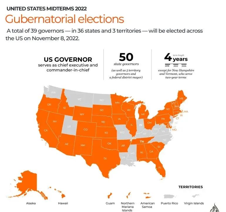 36 个州和3个地区——关岛、北马里亚纳群岛和美属萨摩亚——的选民将在这些中期选举中选举出州长。