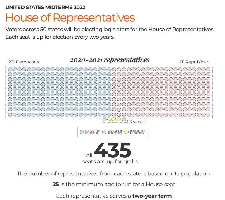 所有 50 个州的选民将选举众议院议员,共有435个席位,每个席位每两年进行一次选举。
