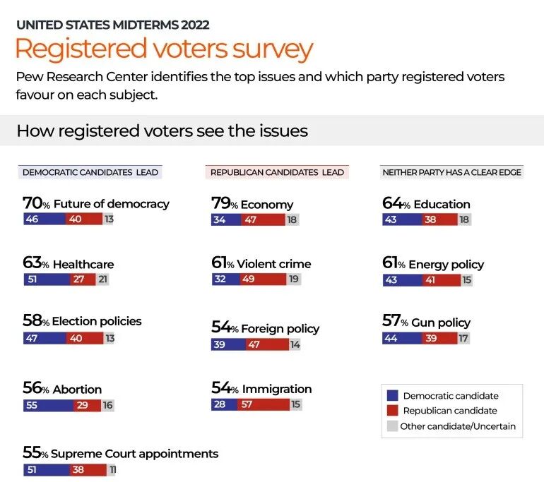 皮尤研究中心调查了重点议题上,登记选民在每个问题上所支持政党比例如下: