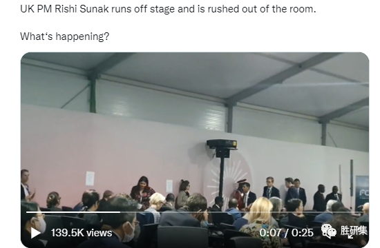 当时,苏纳克正在台上听交流,一名助手打断了他的话。一开始,这名助手对他耳语后,他决定暂时继续留在台上,随后另一名助手催促他,随即他冲出了舞台。