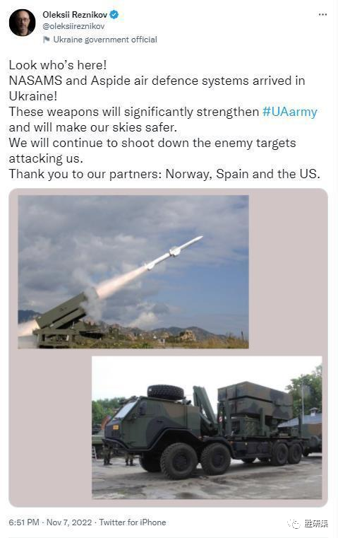11月7日,乌克兰防长说,美国的“NASAMS”和意大利的“阿斯派德”防空导弹系统已运抵乌克兰,沙利文协议的这一条也被满足。